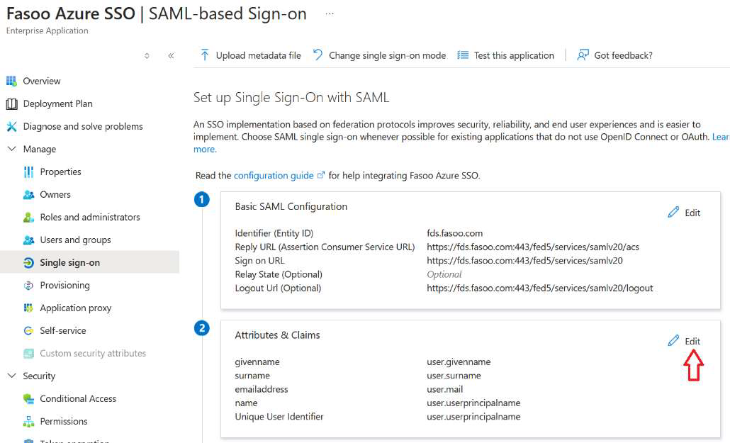 1. In Attributes & Claims click Edit.