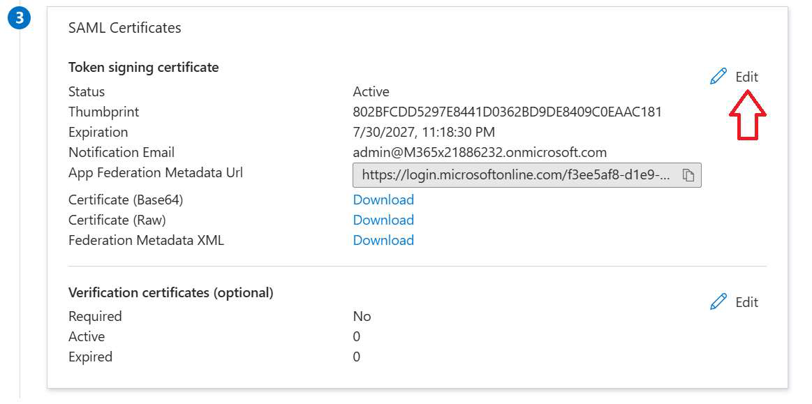 1. To configure the required certificate, click Edit in the SAML Certificates Section.